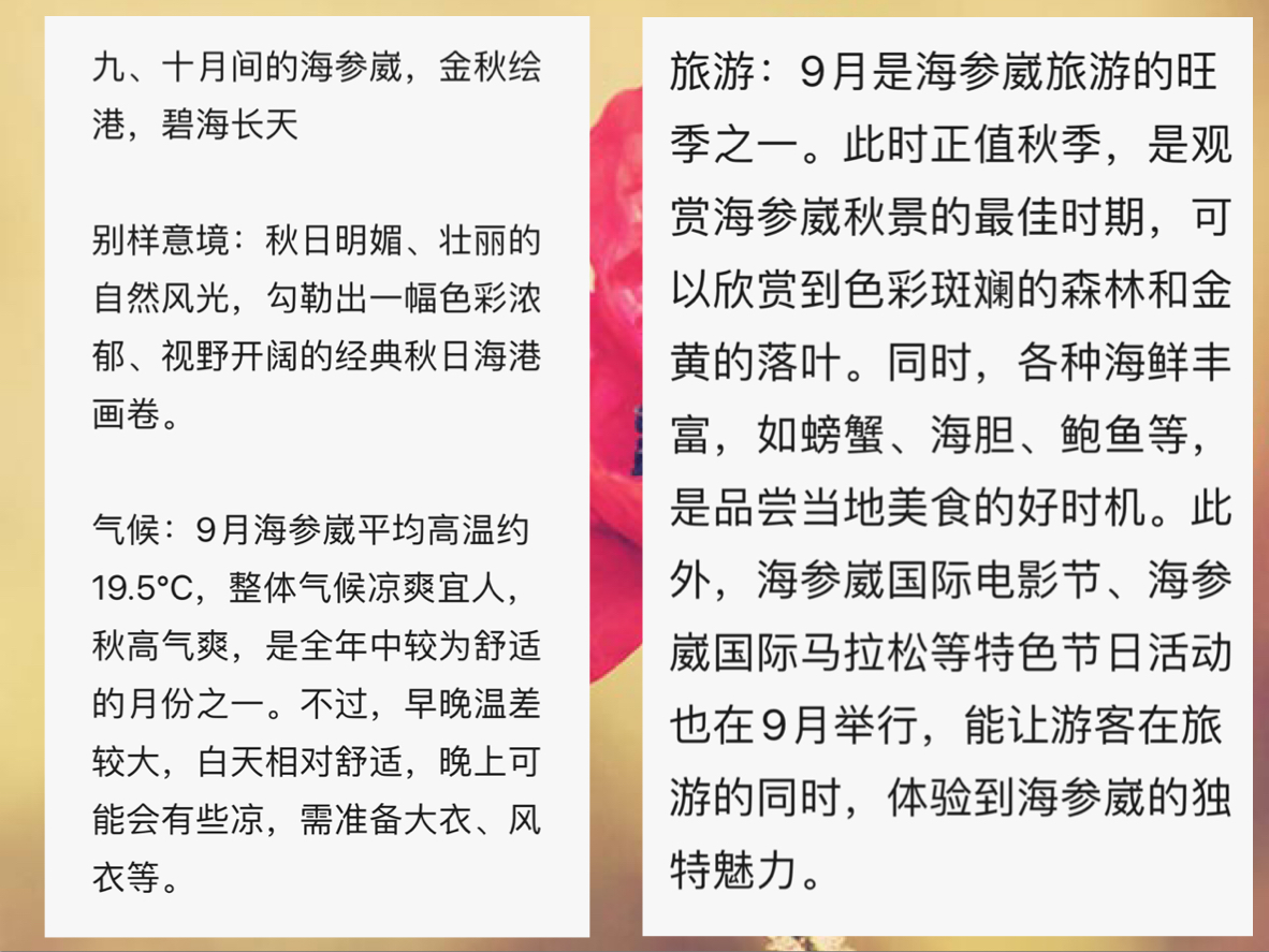 气候:9月海参崴平均高温约19.5℃,整体气候凉爽宜人,秋高气爽,是全年中较为舒适的月份之一。不过,早晚温差较大,白天相对舒适,晚上可能会有些凉,需准备大衣、风衣等。