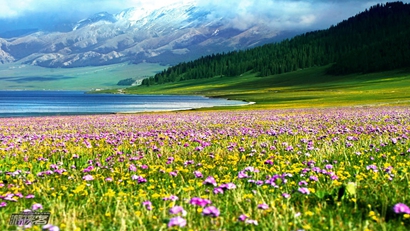 喀拉峻大草原:5月是喀拉峻大草原的赏花季,各种野花如郁金香、野芍药、金莲花等相继绽放,形成一片生机勃勃的景象