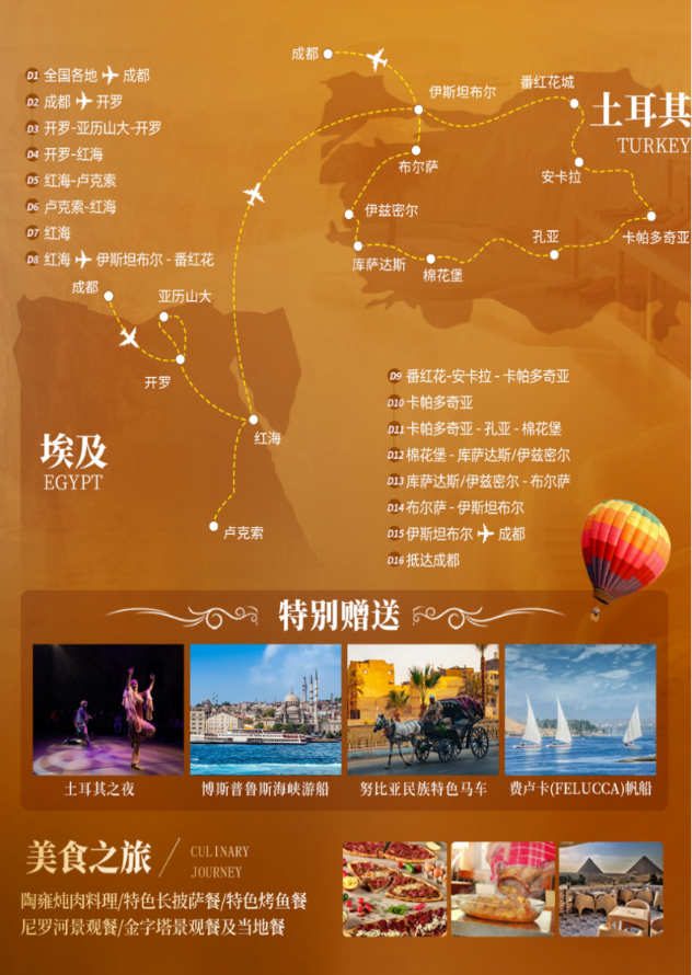 一次出发,穿越千年文明与浪漫欧亚!在埃及探秘金字塔、尼罗河与法老传说,在土耳其漫步清真寺、地中海古城与热气球奇观。历史、人文、自然风光一次尽览,性价比拉满,一段旅程,两倍收获
